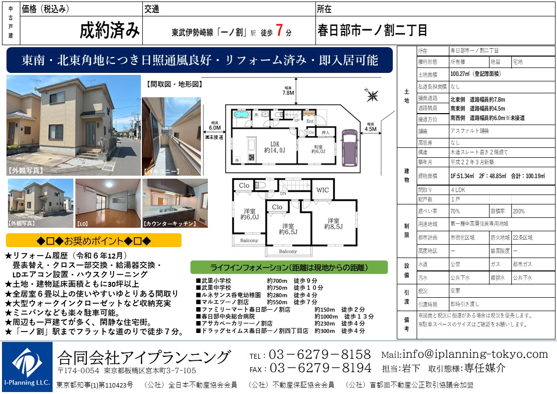 春日部市一ノ割の中古戸建は、おかげさまで成約致しました。